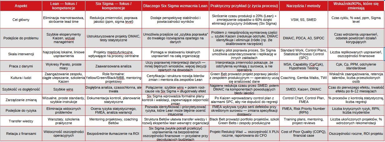 Six Sigma dostarcza ustrukturyzowaną metodykę (Define-Measure-Analyze-Improve-Control), która świetnie uzupełnia ad-hocowe warsztaty Kaizen.